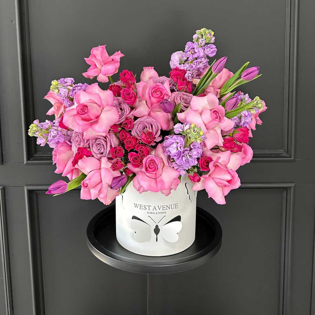 Fresh florals in varying pink shades arranged in our signature box. Our arrangements are arranged in floral foam and require little to no maintenance. This floral arrangement is a half lid arrangement.